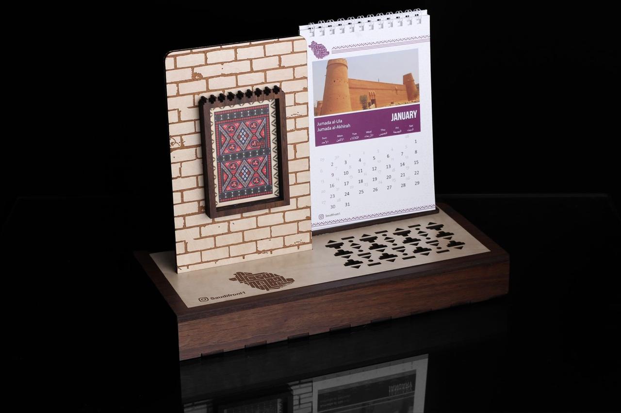 تقويم الباب النجدي استهلم التصميم من ابواب منطقة ( نجد ) بالمملكة والذي يتميز بزخارف ونقوش والحفر والتلوين على الابواب والذي يعكس اهتمام اهل نجد ب العمارة
